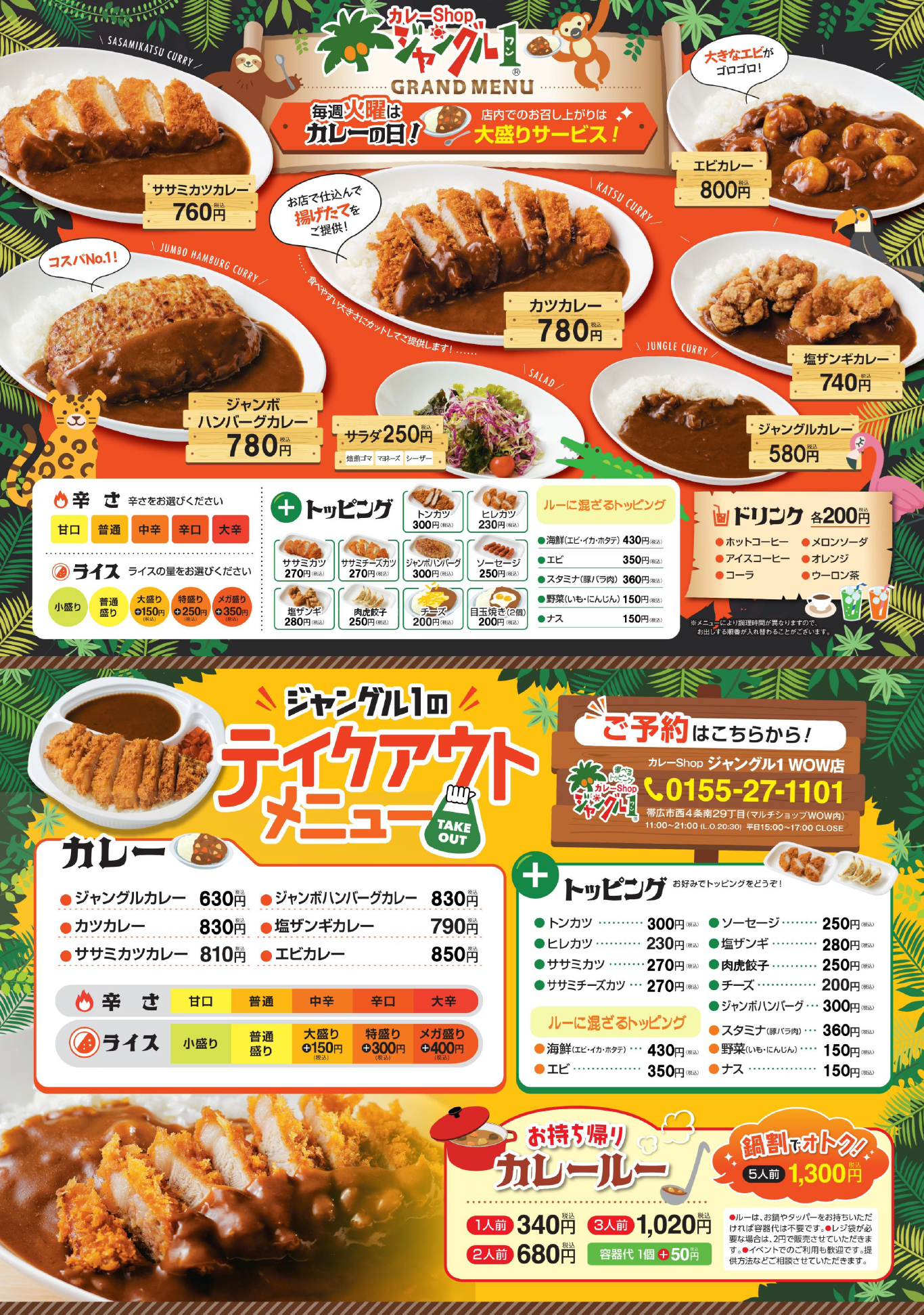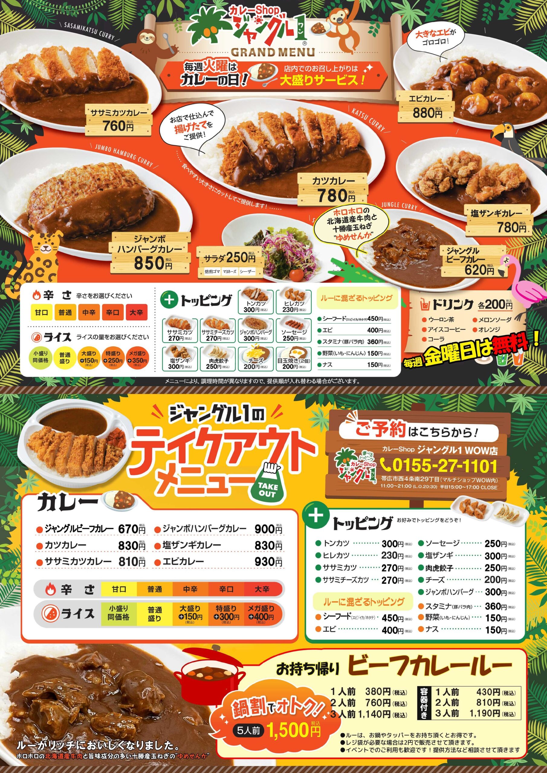 ジャングル1をご利用いただくなら火曜日がとってもお得!店内でのお食事に限り大盛りが無料になります。