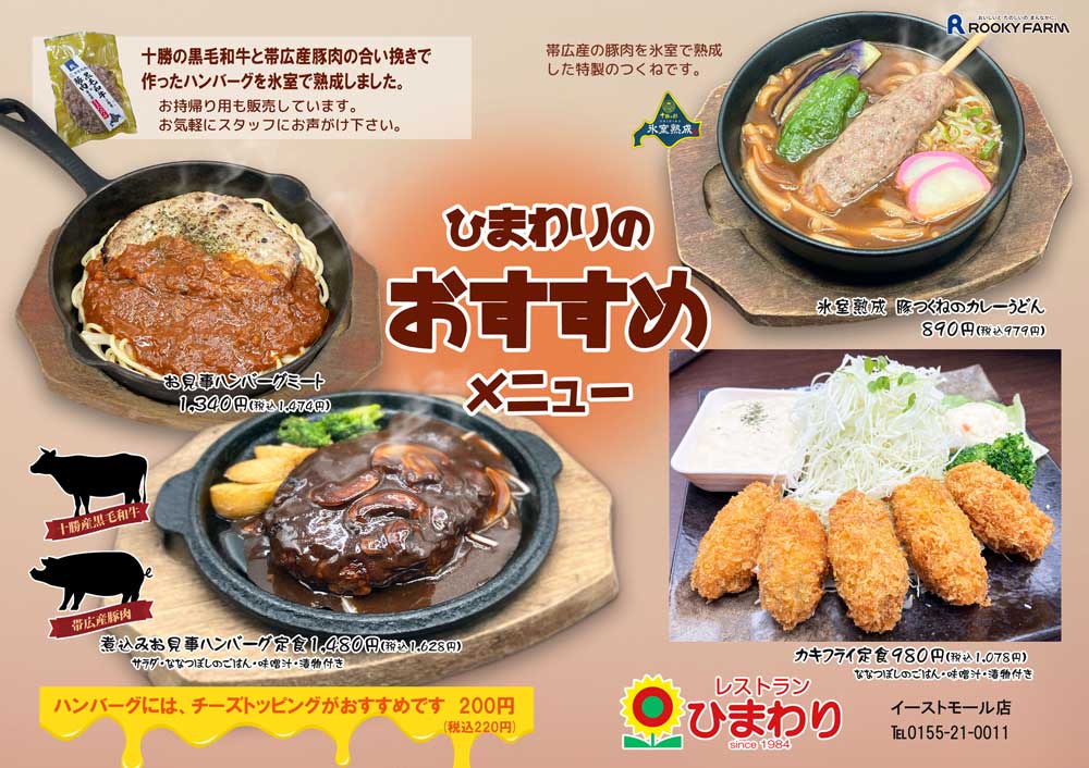 まずは、「お見事ハンバーグミート」十勝の黒毛和牛と帯広産豚肉の合い挽きで作ったハンバーグをひむろで熟成した、お肉の味を最大限引き出したハンバーグに、熱々のミートソースをかけたパスタです。次に「煮込みお見事ハンバーグ定食」先ほどご紹介した氷室熟成ハンバーグを煮込みました。白ご飯にバウンドして食べるのが最高です。そして「氷室熟成 豚つくねのカレーうどん」このつくねは、焼いても煮てもとにかく美味しいオススメしたいつくねです。カレーの汁が染みたあたたまる一品です。最後に「カキフライ定食」サクサクに揚げた熱々のカキをタルタルソースに絡めてお召し上がりください。