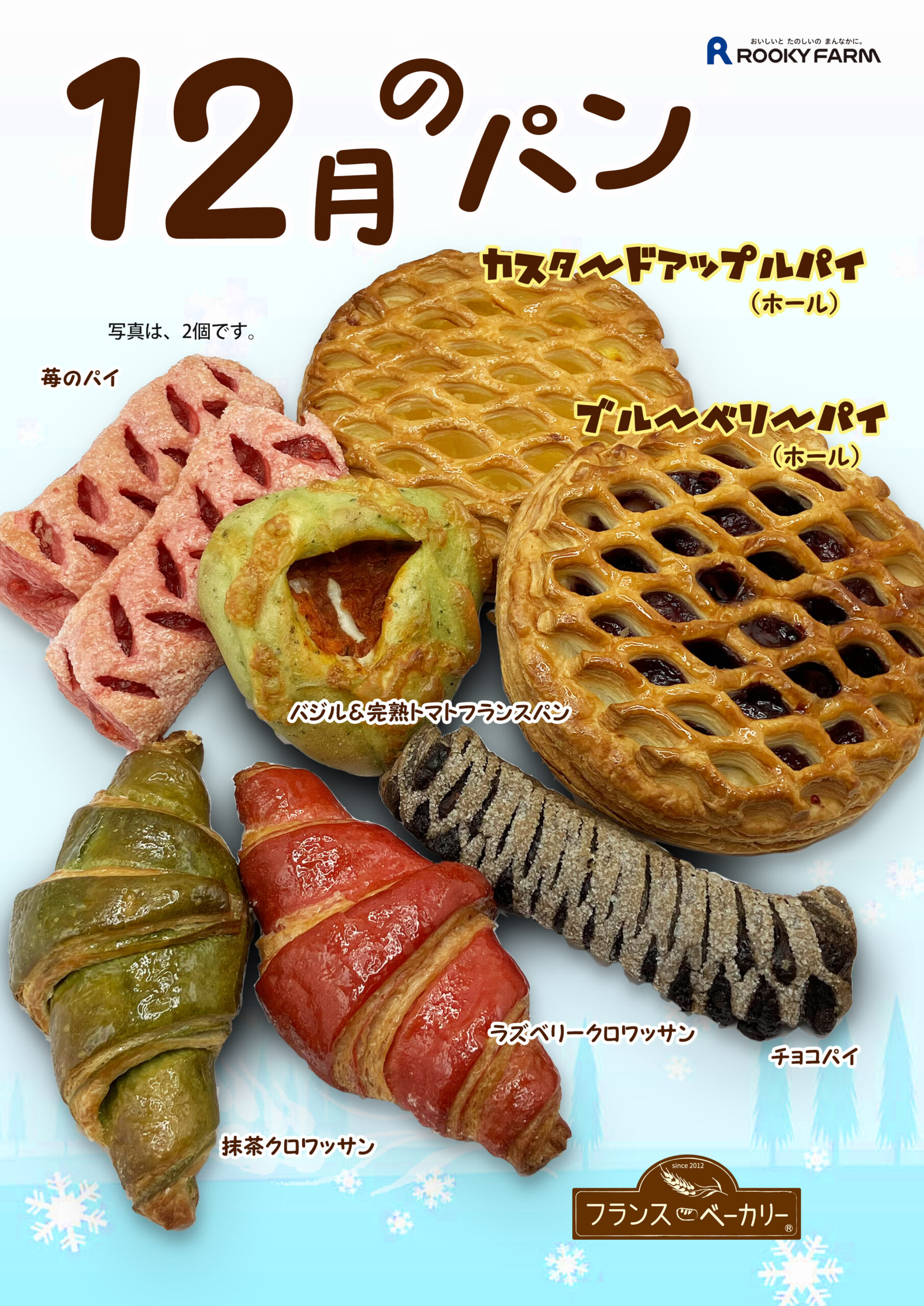 日頃よりフランスベーカリーをご利用いただきましてありがとうございます。フランスベーカリーより、12月のセレクトパンのご紹介です♪ 今月は7品目をご用意いたしました。そのうち2品はホールのパイ♪ボリュームたっぷりなので皆さんでシェアしてお茶の時間にご一緒にいかがですか?