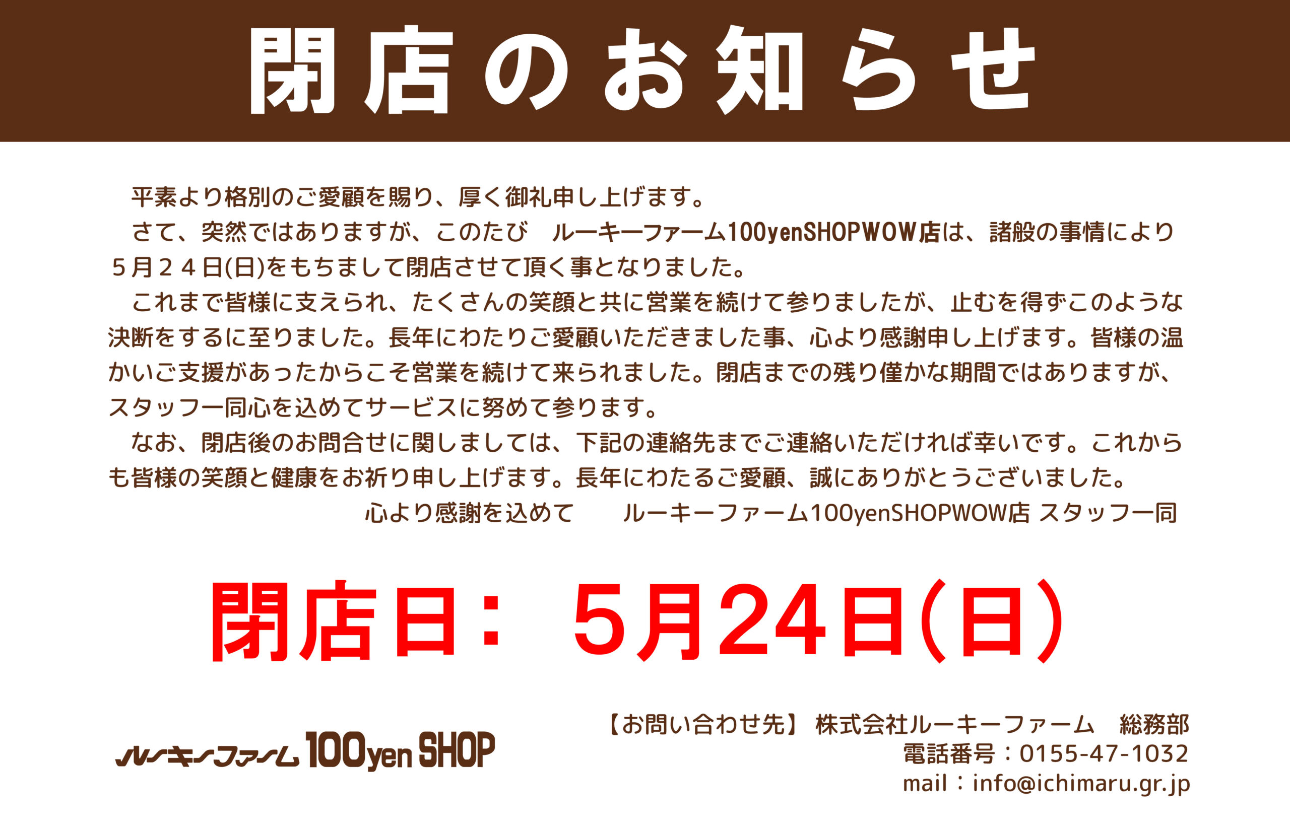 ルーキーファーム「100yenSHOP WOW店 」閉店のお知らせ